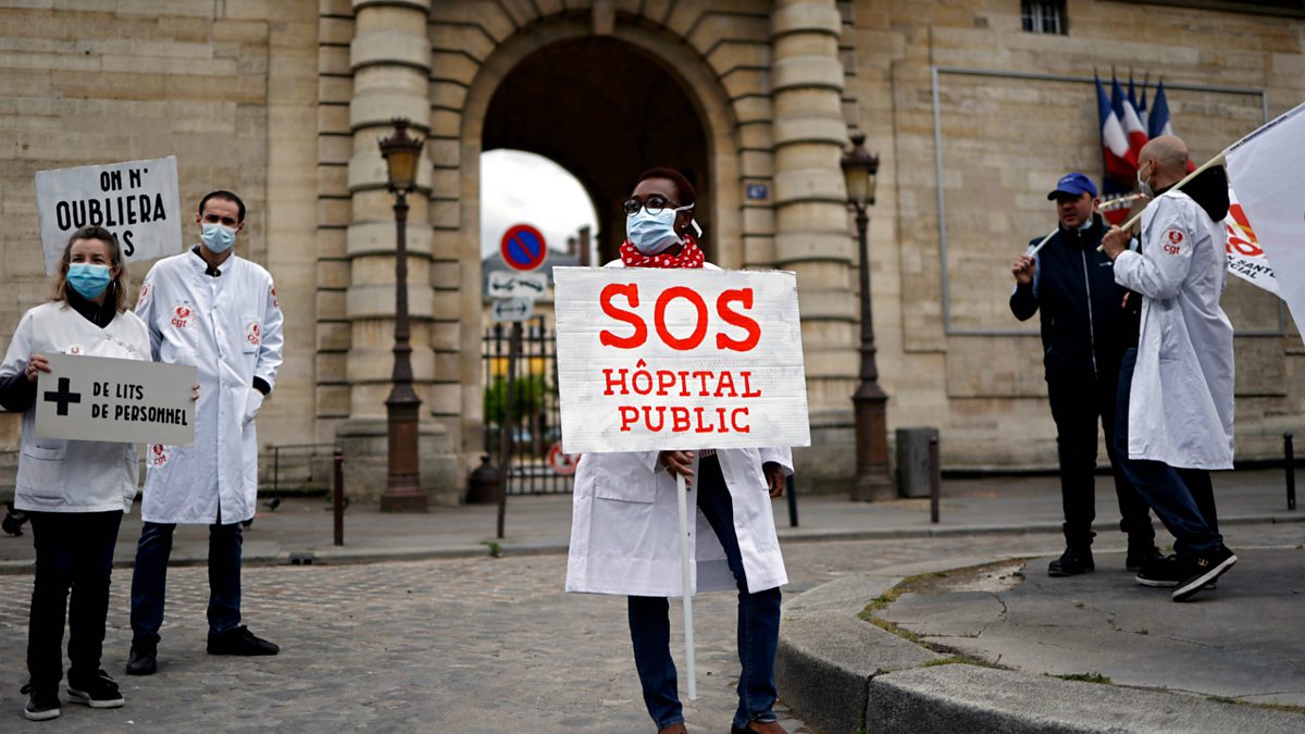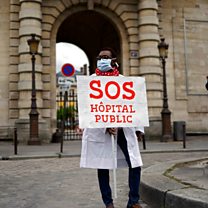 (Photo: A care worker and member of a union holds a placard during a demonstration outside a hospital in Paris Credit: AFP)