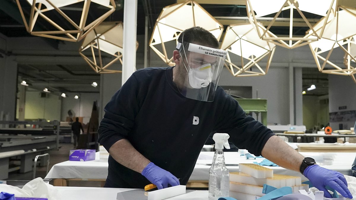 (Photo: Basque company makes rubber gloves, April 2020 in Bilbao, Spain. Credit: H. Bilbao/Europa Press via Getty Images)