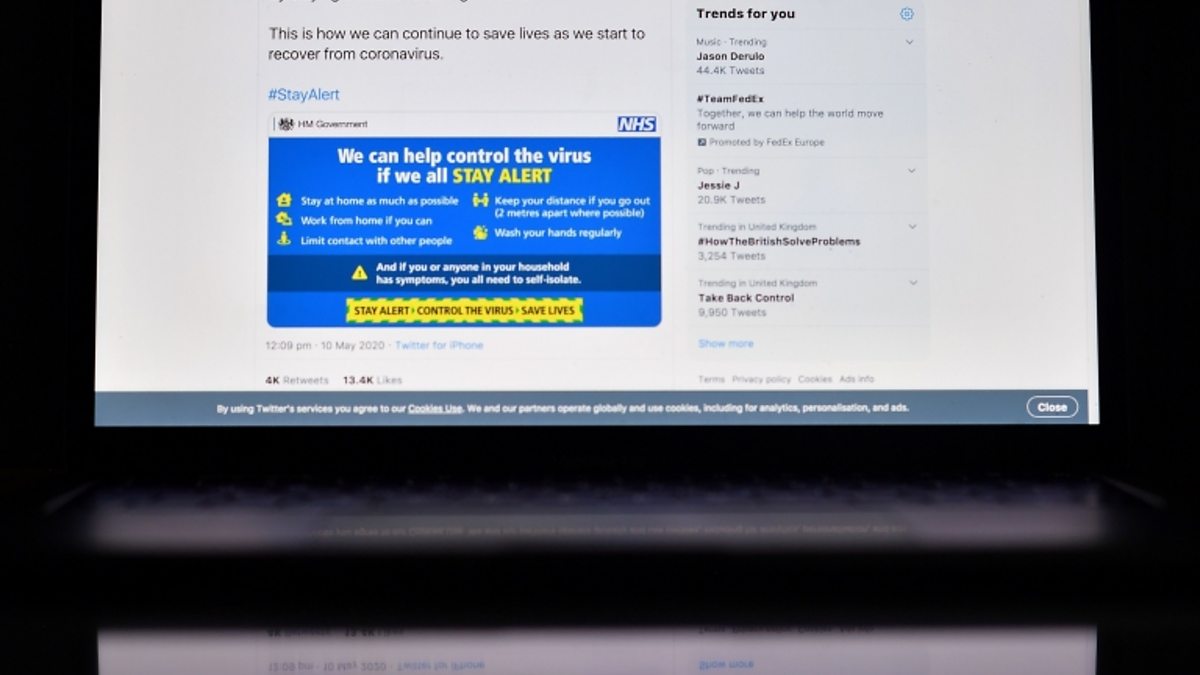 (Photo: The Twitter page of Britain's Prime Minister Boris Johnson, with the UK Government's new "Stay Alert, Control the Virus, Save Lives" slogan, in relation to the COVID-19 pandemic. Credit: Ben Stansall/AFP via Getty Images)