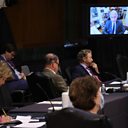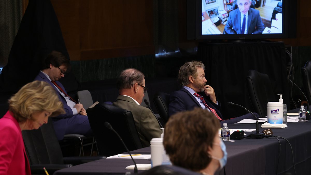 (Photo: US Senators listen to Dr. Anthony Fauci, director of the National Institute of Allergy and Infectious Diseases, speak remotely during a Senate Health, Education, Labour and Pensions Committee hearing on Capitol Hill on 12 May 2020 in Washington, DC. The committee is hearing testimony from members of the White House Coronavirus Task Force on how to safely open the country and get America back to work and school. Credit: Win McNamee/Getty Images)