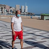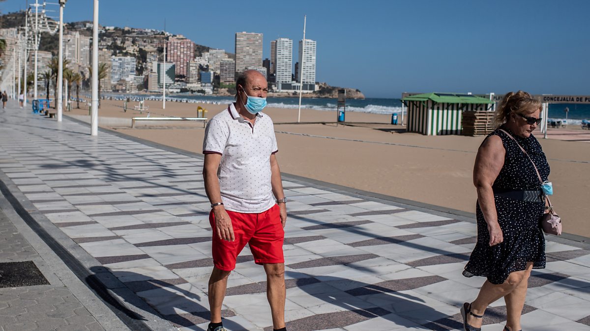 (Photo: A man wearing a protective face mask walks along the promenade of the closed Playa de Levante Beach on May 11, 2020 in Benidorm,Spain. Credit: David Ramos/Getty Images)