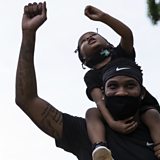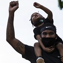 (Picture: A child and man raise their fist in protest near the White House, where there has been a week of protests over the death of George Floyd. Credit: EPA/SARAH SILBIGER)