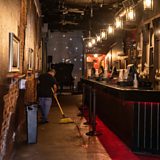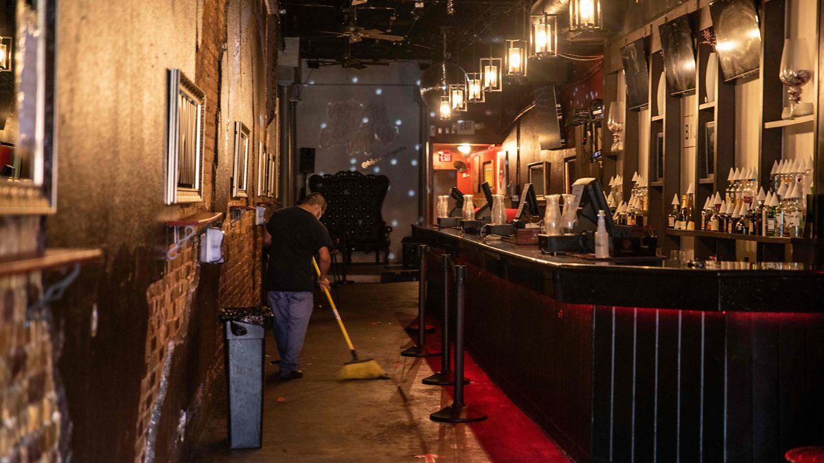 (Photo: An employee sweeps inside a closed bar in Austin, Texas, June 26, 2020. - Texas Governor Greg Abbott ordered bars to be closed by noon on June 26 and for restaurants to be reduced to 50% occupancy. Coronavirus cases in Texas have spiked in recent weeks after being one of the first states to begin reopening. Credit: Sergio FLORES / AFP)