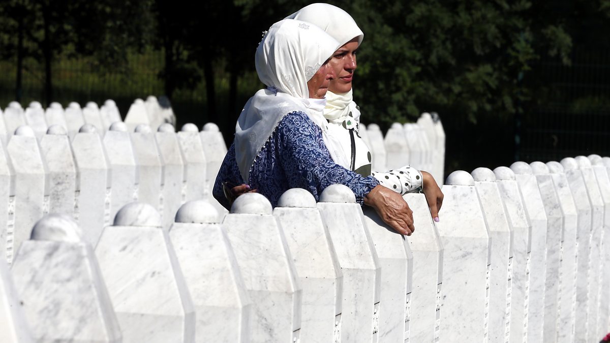 Picture: Bosnian Muslim women mourn next to gravestones during a funeral ceremony at the Potocari Memorial Center and Cemetery, in Srebrenica, Bosnia and Herzegovina, 11 July 2020. Credit: EPA/FEHIM DEMIR.