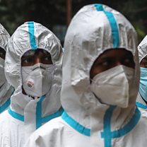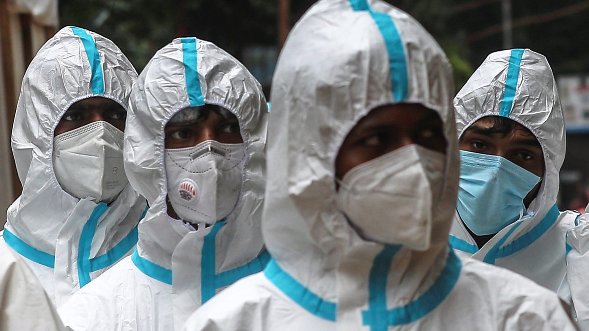 (Photo: Indian health workers wearing personal protective equipment (PPE) arrive at a residential building in Mumbai, India. Credit: EPA).