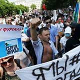 (Photo: People take part in a rally in support of arrested governor in Khabarovsk. Credit: Reuters/ Evgenil Pereverzev.)