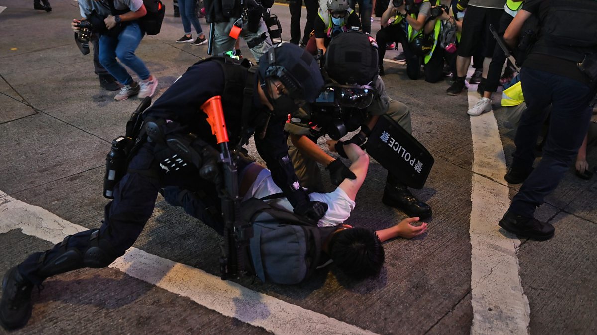(Image: Police officers detain protesters in Hong Kong during a rally against the new national security law. Credit: EPA/Miguel Candela)