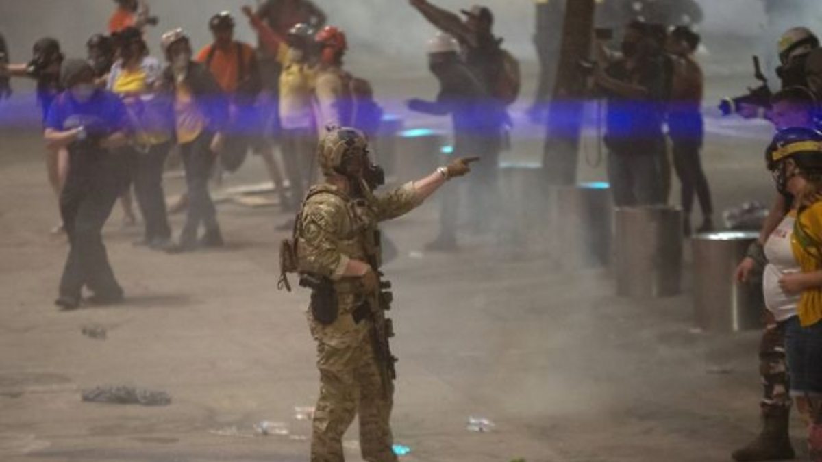 (Photo: A federal officer points to a protester while clearing the street near the courthouse in Portland. Credit: Getty Images)