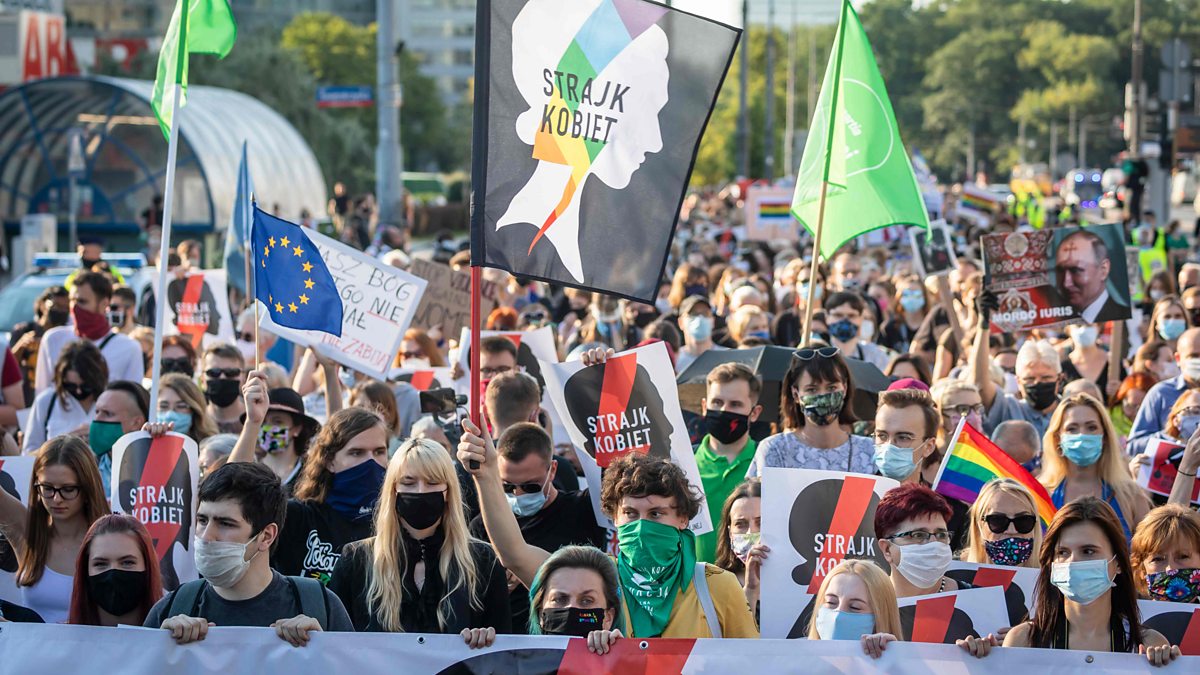 (Photo: Protesters hold banners reading 'Women's Strike' as they take part in protest against the Polish government plans to withdraw from the Istanbul Convention on prevention and combatting of domestic violence, in Warsaw, Poland on 24 July 2020. Credit: Wojtek Radwanski / AFP via Getty Images)