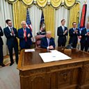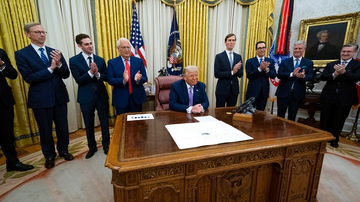 (Photo: US President Donald Trump announces a peace agreement to establish diplomatic ties between Israel and the UAE at the White House on 13 August 2020. Credit: EPA/Doug Mills)