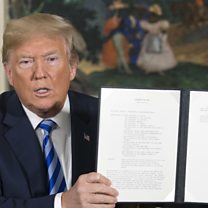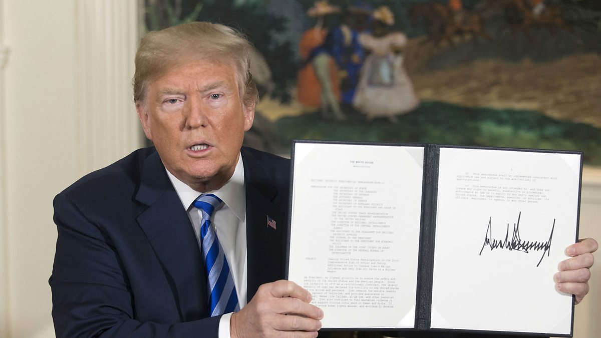 (Image: President Donald J. Trump holds up a presidential memorandum he just signed to pull out of Iran nuclear deal at the White House in Washington DC on 8 May 2018. Credit: EPA / Reynolds)