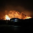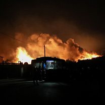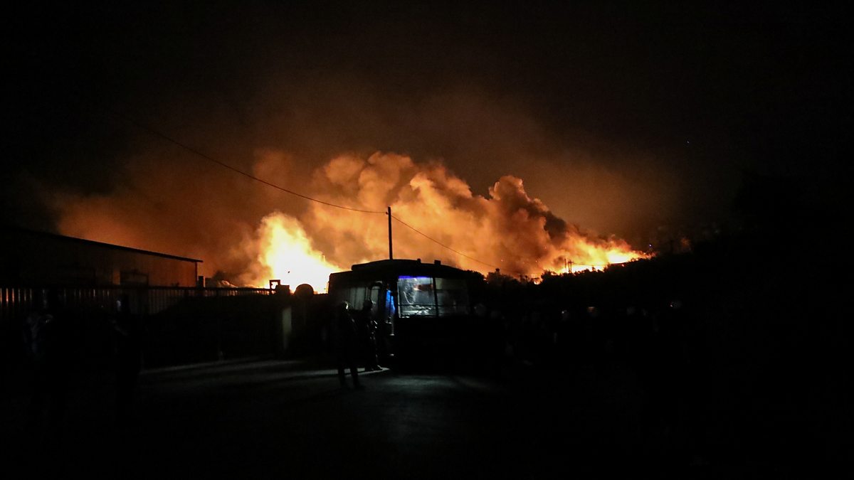 (Photo: A fire burns at the Moria migrant camp on the island of Lesbos, Greece, early on Wednesday. Credit: Elias Marcou / Reuters)
