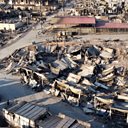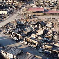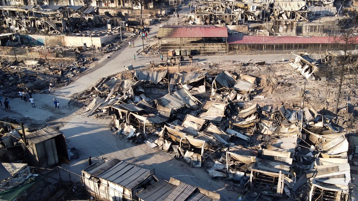 (Photo: An aerial view of destroyed shelters following a fire at the Moria camp. Credit: REUTERS/Alkis Konstantinidis)