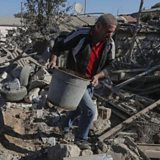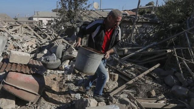 (Photo: A man removes debris in the Nagorno-Karabakh capital, Stepanakert. Credit: Reuters)