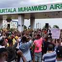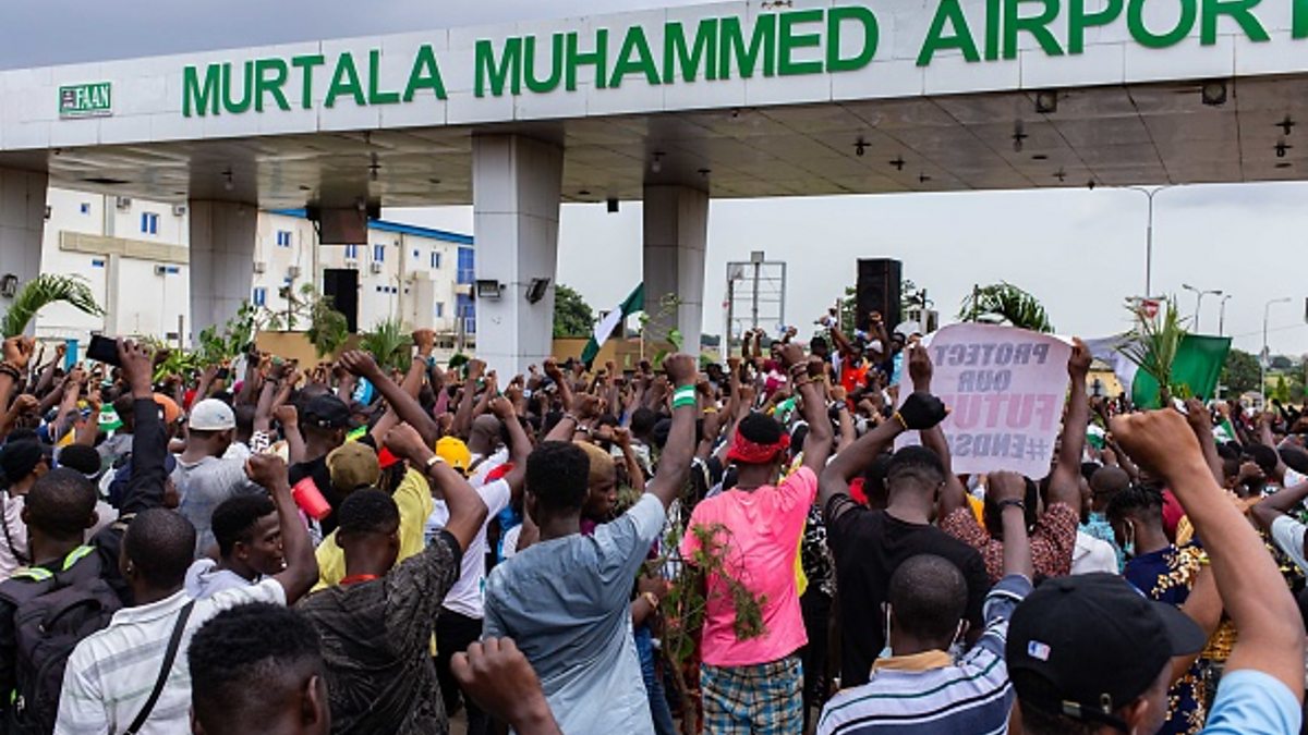(Photo: Protesters at Nigeria's Murtala Muhammed airport tollgate on October 19th 2020. Credit: Benson Ibeabuchi/AFP via Getty Images.)
