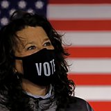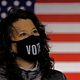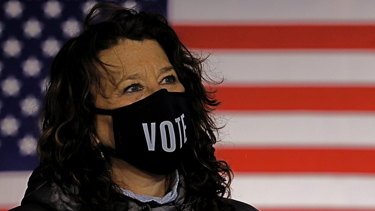(Photo: A woman wearing a face mask with the word "vote" at a campaign drive-in for Joe Biden. Credit: Reuters).