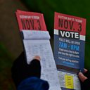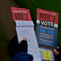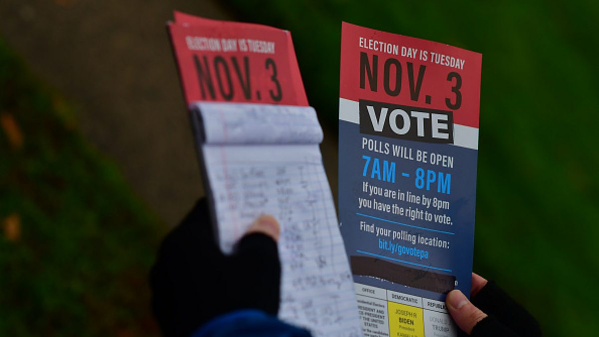 (Picture: Election pamphlets being held by a canvasser in Landsdowne, Pennsylvania. Credit: Mark Makela/Getty Images)