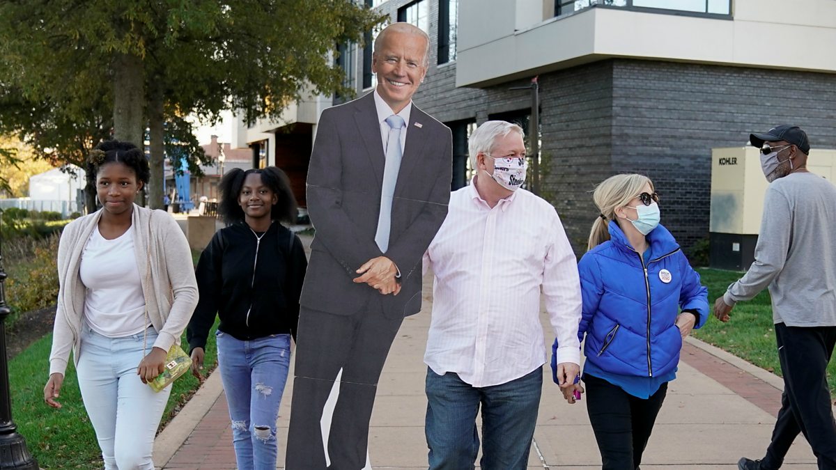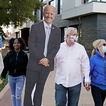 (Image: People carry a cardboard cut-out of U.S. Democratic presidential candidate Joe Biden near the site where Biden is expected to claim victory in Wilmington, Delaware, on 6 November 2020. Credit: Lamarque/Reuters)