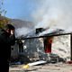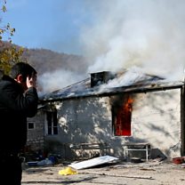 (Picture: A man reacts as he stands near a house set on fire by departing Ethnic Armenians in the village of Cherektar, in the region of Nagorno-Karabakh Credit: Reuters)