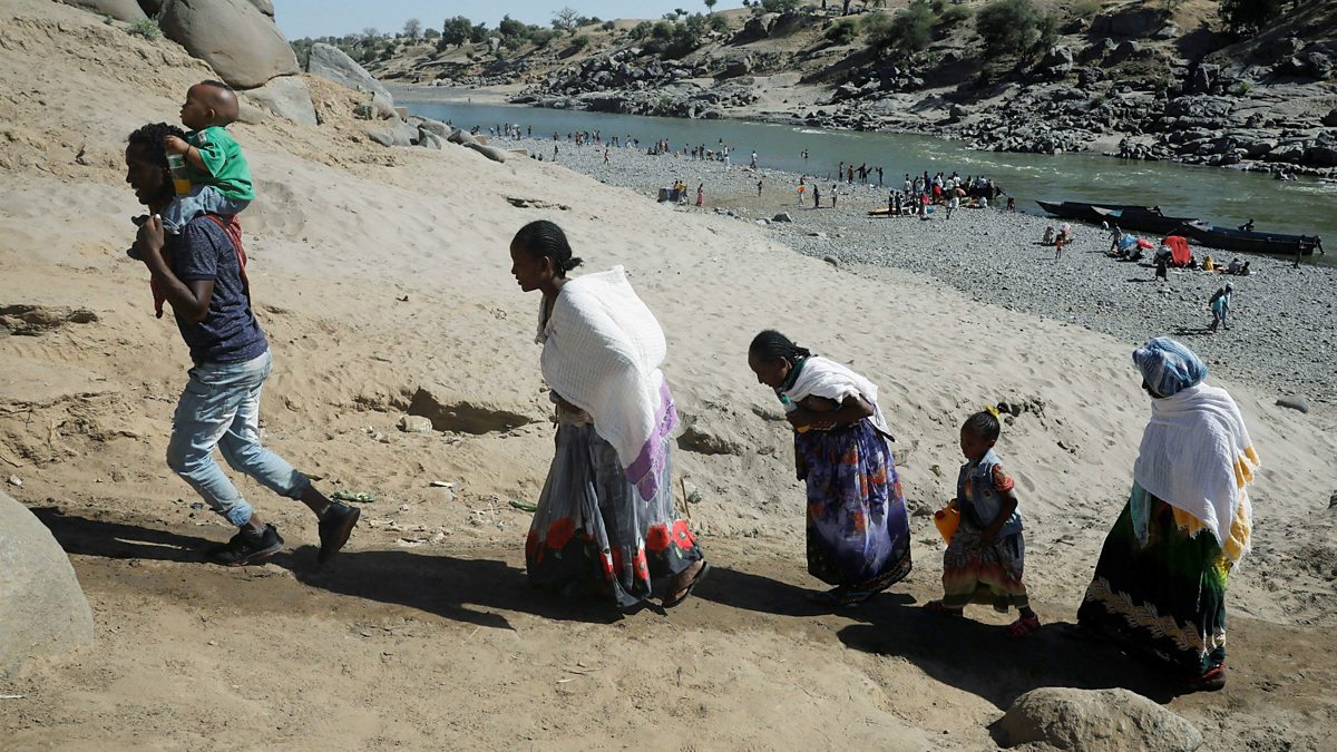 (Image: Ethiopians who have just crossed a river from Ethiopia to Sudan to flee from the Tigray region walk towards the Hamdeyat refugees transit camp on 1 December 2020. Credit: Reuters/Ratner)