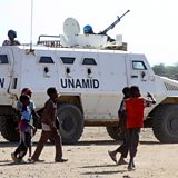 (Photo: Sudanese children walk past an armoured vehicle of the United Nations and African Union peacekeeping mission (UNAMID) in Kalma Camp for internally displaced people in Nyala, the capital of South Darfur, on December 30, 2020. - The United Nations Security Council has agreed to end the UNAMID's long-running peacekeeping mission in Darfur when its mandate ceases on December 31. The withdrawal of UNAMID, deployed since 2007 and which had 16,000 peacekeepers at its peak, will begin January 1 and is expected to be completed by June 30 2021. Credit: AFP via Getty Images)