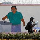 (Photo: A man walks past a painting on the wall of the Ugandan electoral commission compound in Kampala, Uganda January 13. Credit: Reuters.)