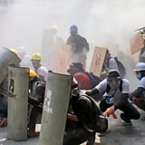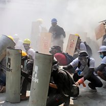 ( Photo: Protesters take cover as they clash with riot police officers during a protest against the military coup in Yangon, Myanmar. Credit: REUTERS/Stringer)
