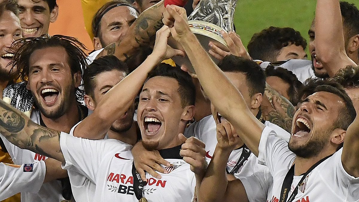 Photo: Players of Sevilla celebrate their victory after their team crowned 2020 UEFA Europa League champions with a 3-2 win against Italy's Inter Milan (credit: Getty images)