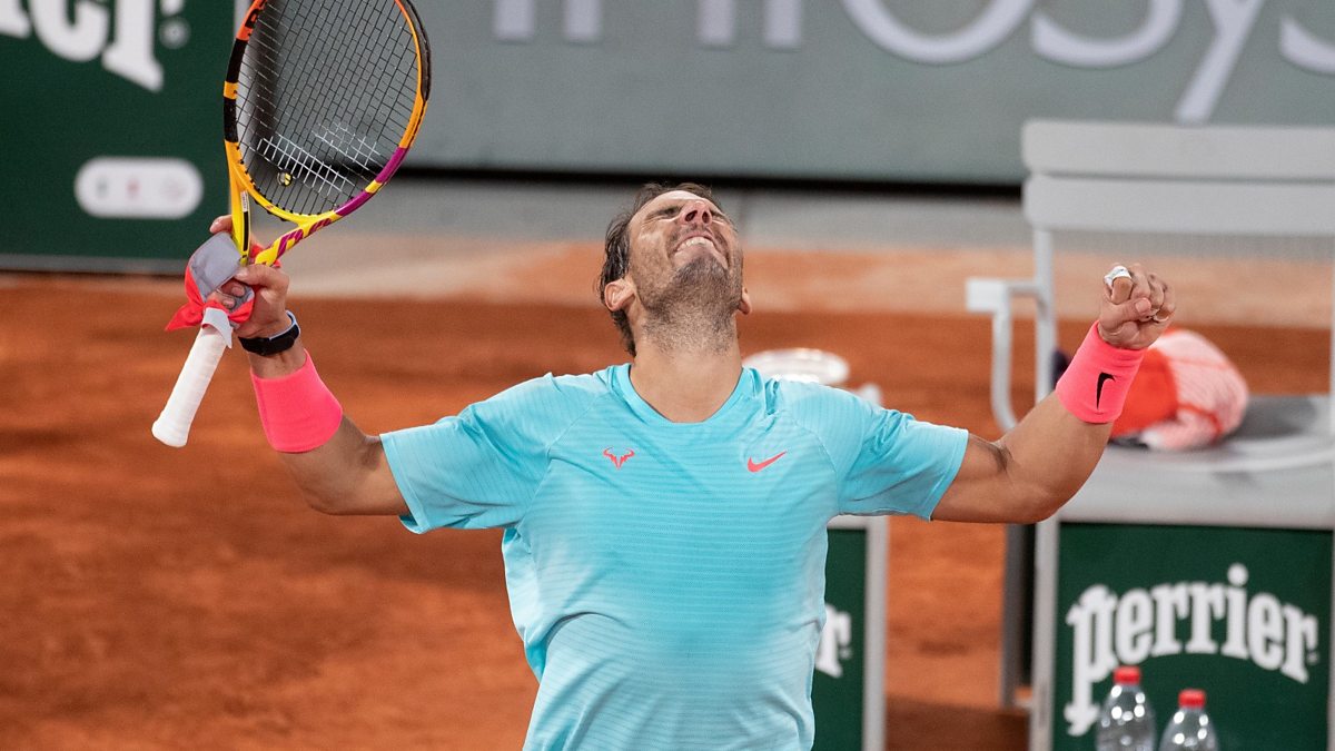 Photo: Rafael Nadal of Spain celebrates his victory against Jannik Sinner of Italy in the Quarter Finals of the singles competition on Court Philippe-Chatrier during the French Open Tennis Tournament at Roland Garros on October 6th 2020 in Paris, France. (Photo by Tim Clayton/Corbis via Getty Images)