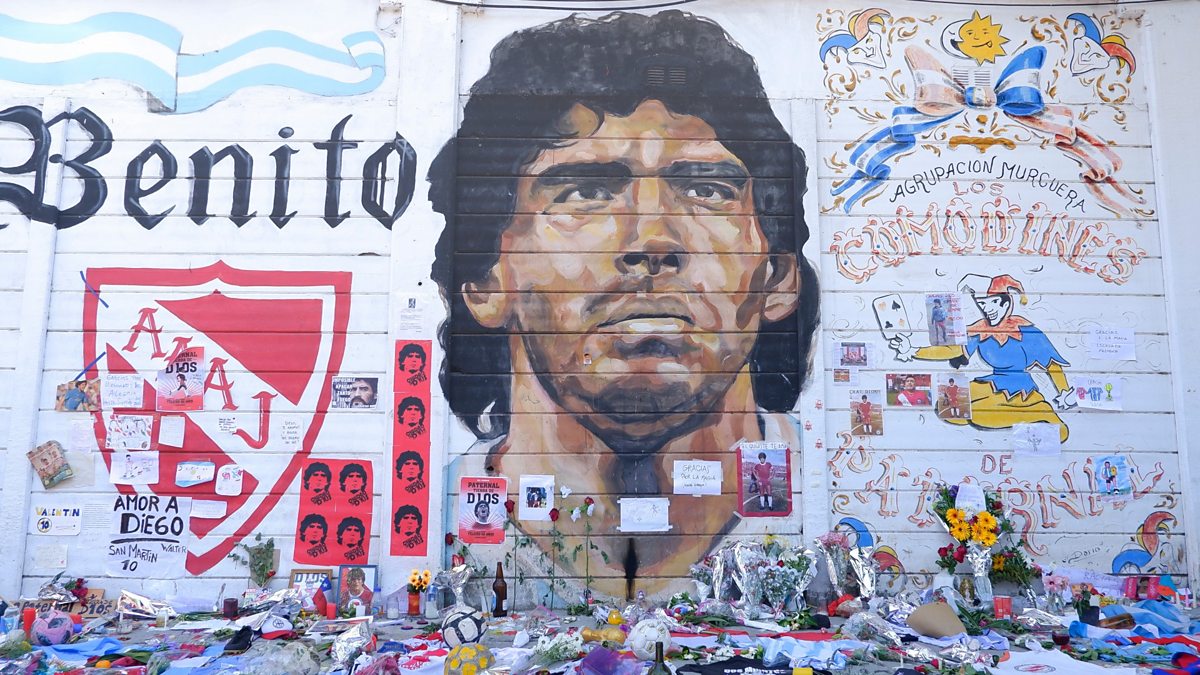 Image:Fans place offerings to late Diego Maradona in front of mural outside Argentinos Juniors' Stadium Diego Maradona on November 26, 2020 in Buenos Aires, Argentina. (Getty Images).