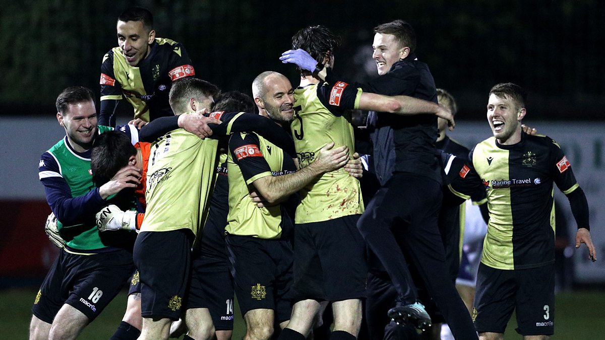 Photo: Marine FC players celebrate winning their Emirates FA Cup second round match against Havant & Waterlooville. (Credit: Getty Images)