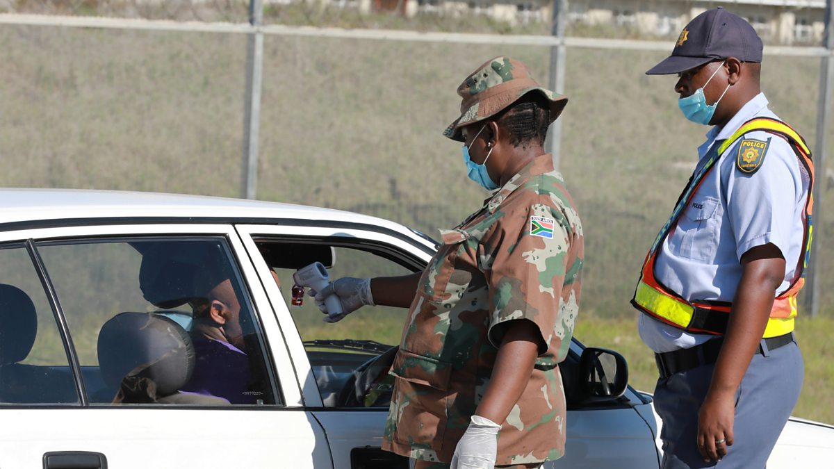(Picture: A South African Defence Force medic checks the temperature of a motorist with a thermometer in Cape Town, South Africa. Picture credit: Getty Images.)