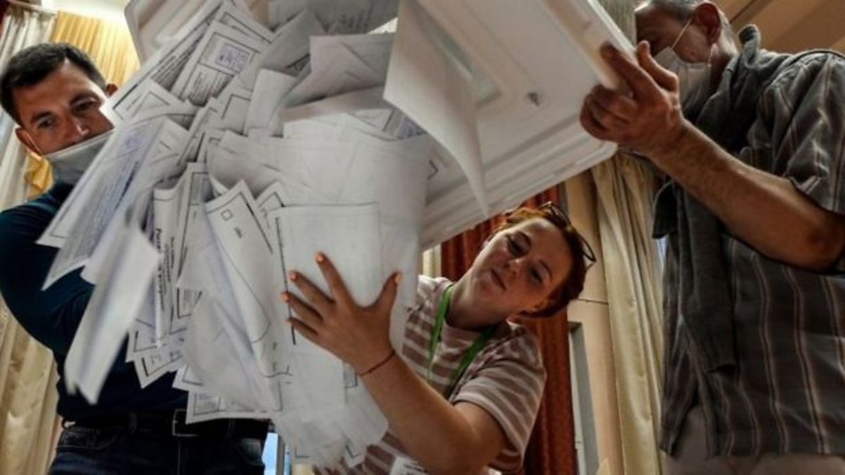 (Picture: Election officials empty bulletins from a voting box at a polling station in Moscow, Russia. Credit: AFP)