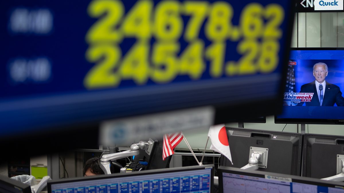 (Image: Joe Biden on a TV screen with share prices in the foreground. Credit:Philip Fong/ Getty Images)