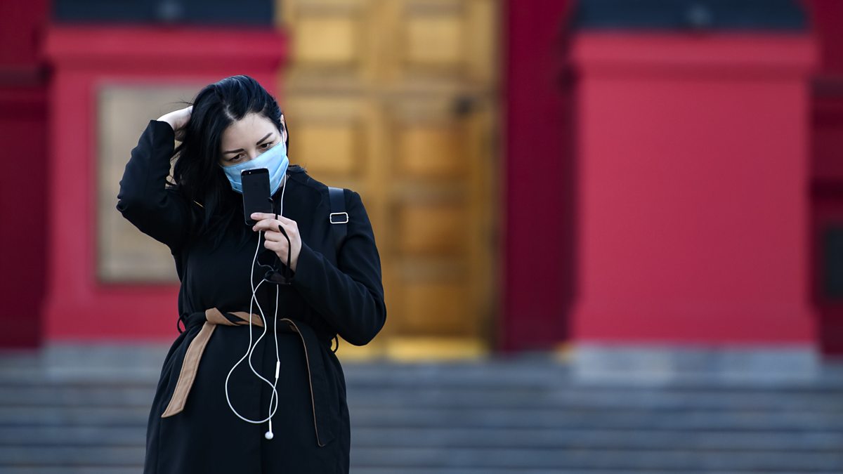 (Image: Girl in facemask takes a selfie in Kyiv. Credit: Getty)
