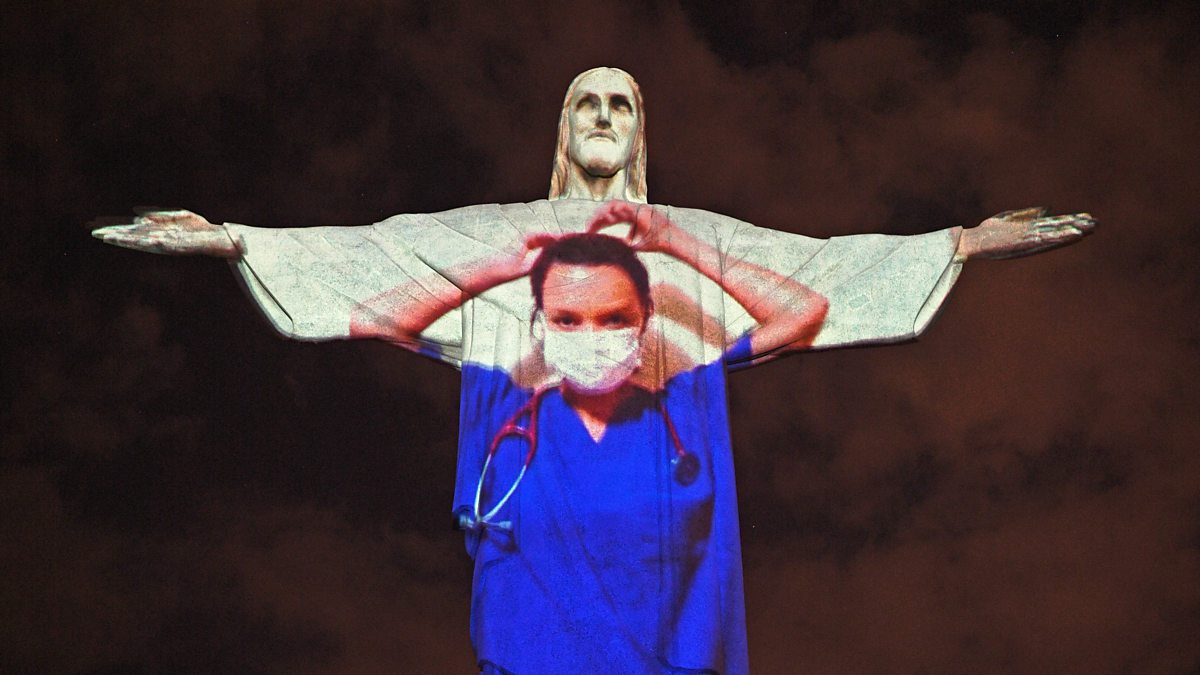 (Picture: A nurse projected onto Brazil's Christ the Redeemer statue. Picture credit: Getty Images.)