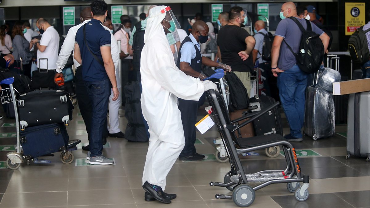 (Picture: A Lagos airport worker in protective gear pushes a wheelchair. Picture credit: EPA.)