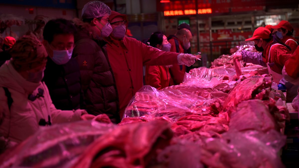 (Picture: Customers wearing face masks buy meat at a wholesale market in Beijing, China. Credit: Reuters)