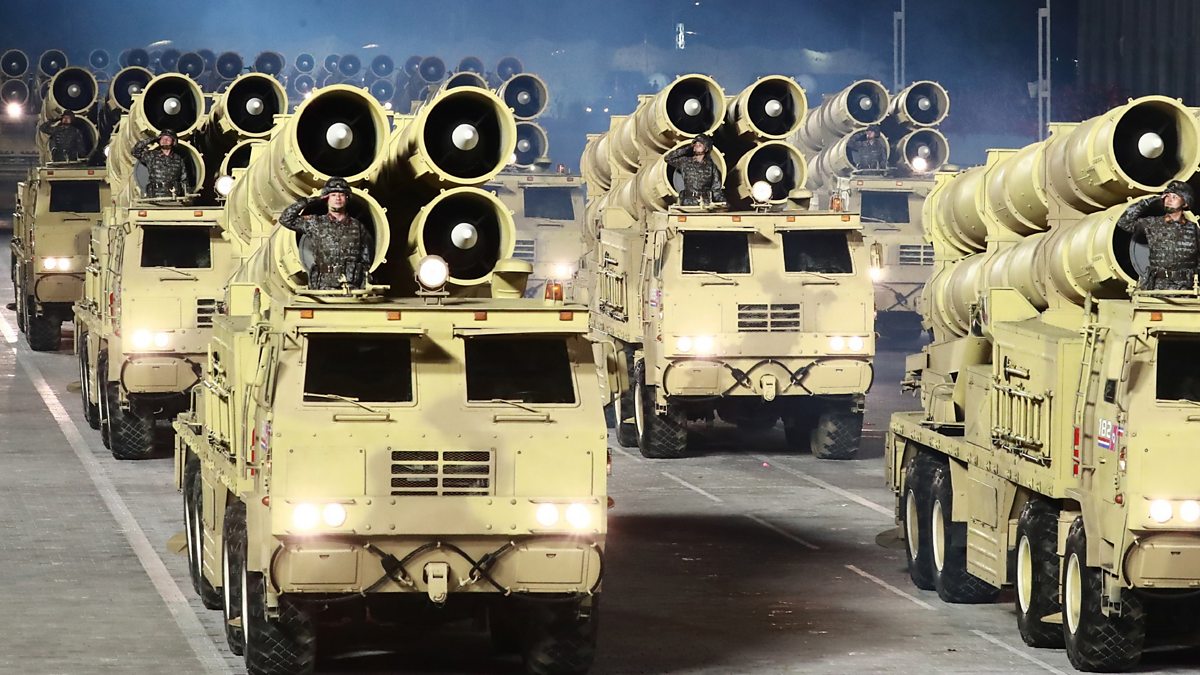 North Korean leader Kim Jong-un shows off intercontinental ballistic missiles at a military parade in the capital Pyongyang, marking the seventy-fifth anniversary of the country's ruling party.