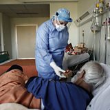 (Picture: Nurse offers a small present to a patient recovering from COVID-19, at Attiko hospital in Athens, Greece, 23 December 2020 (issued 26 December 2020. CREDIT: EPA/YANNIS KOLESIDIS)
