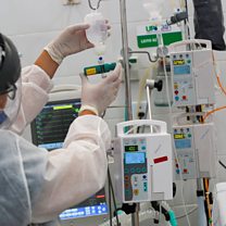 (Photo: A medical worker administers medication to a patient in ICU in Sao Carlos, Brazil Credit: REUTERS/Amanda Perobelli)
