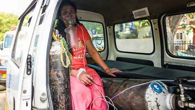 (Photo: A woman with access to oxygen waits for admission at the LNJP Hospital in Delhi. Credit: Getty Images)