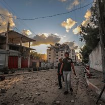 (Image: Palestinians walk next to a destroyed building after an Israeli air strike in Gaza City, 17 May 2021/ Credit: EPA/HAITHAM IMAD)