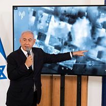 (Image: Israeli Prime Minister Benjamin Netanyahu gestures as he shows a slideshow during a briefing to ambassadors to Israel at the Hakirya military base in Tel Aviv, Israel, 19 May 2021/ Credit: EPA/SEBASTIAN SCHEINER / POOL)