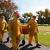 (Photo: gravediggers carry a coffin wearing protective equipment during an exercise for coronavirus disease burials in Buenos Aires, Argentina May 17, 2021. Credit: REUTERS/Agustin Marcarian)