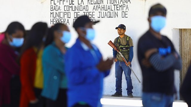 (Image: a community police officer keeps watch near a polling station as people queue to vote during mid-term election in Alyahualtempa, Guerrero state, Mexico, June 6, 2021 / Credit: REUTERS/Edgard Garrido)