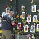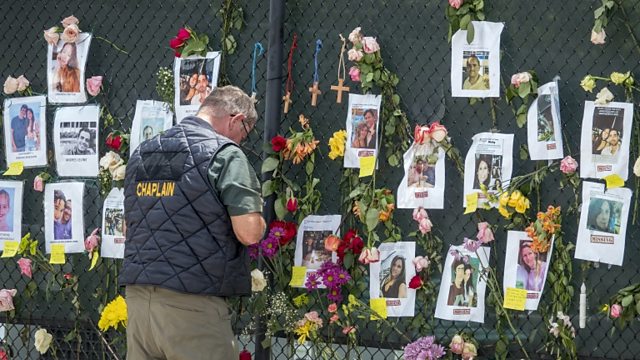 (Photo: Chaplain Polk County Sheriff Office Ossler Robert prays in front of the missing persons memorial installed near the partially collapsed 12-story condominium building in Surfside, Florida, USA, 26 June 2021. Credit: EPA/Cristobal Herrera-Ulashkevich)