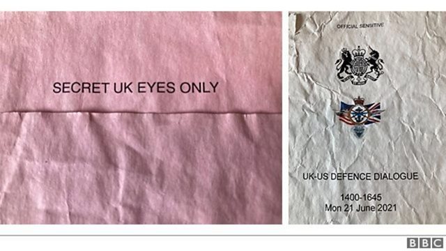 (Photo: Photo from the Ministry of Defence Documents. In one “secret, UK eyes only” can be read, in another it says “UK-US Defence dialogue”. Credit: BBC).