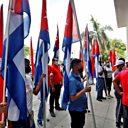 (Picture: People with Cuban flags outside the national headquarters of the Union of Young Communists in Havana. Credit: EPA/Ernesto Mastrascusa)
