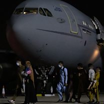(Photo: evacuees arrive at Royal Air Force Brize Norton escorted by UK Armed Forces personnel, Britain, UK, 26 Aug 2021. Credit: MoD / Crown)
